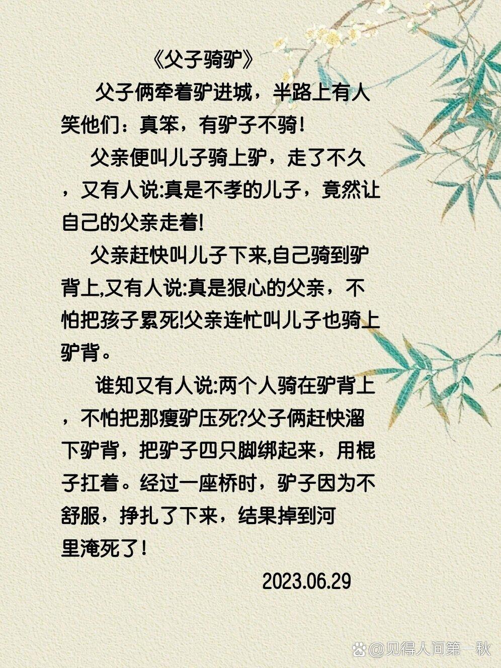 父亲便叫儿子骑上驴。走了不久,又有人说: 真是不孝的儿子, 竟然让自己的父亲走!