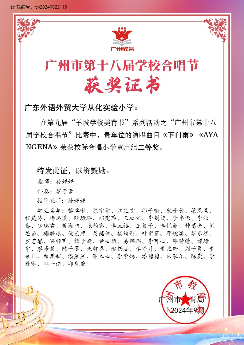我校在广州市第十八届学校合唱节中获广州市二等奖